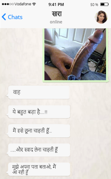 फिर मैंने अपना लंड किसी लड़की पर आज़माने का निश्चय किया. मुझे एक डेटिंग एप पर एक लड़की मिल गयी और हमने चैटिंग शुरू कर दी. बाद में मैंने उसे अपने सामान की एक फ़ोटो भेजी और ये रहा उसके रीऐक्शन का स्क्रीन्शाट: